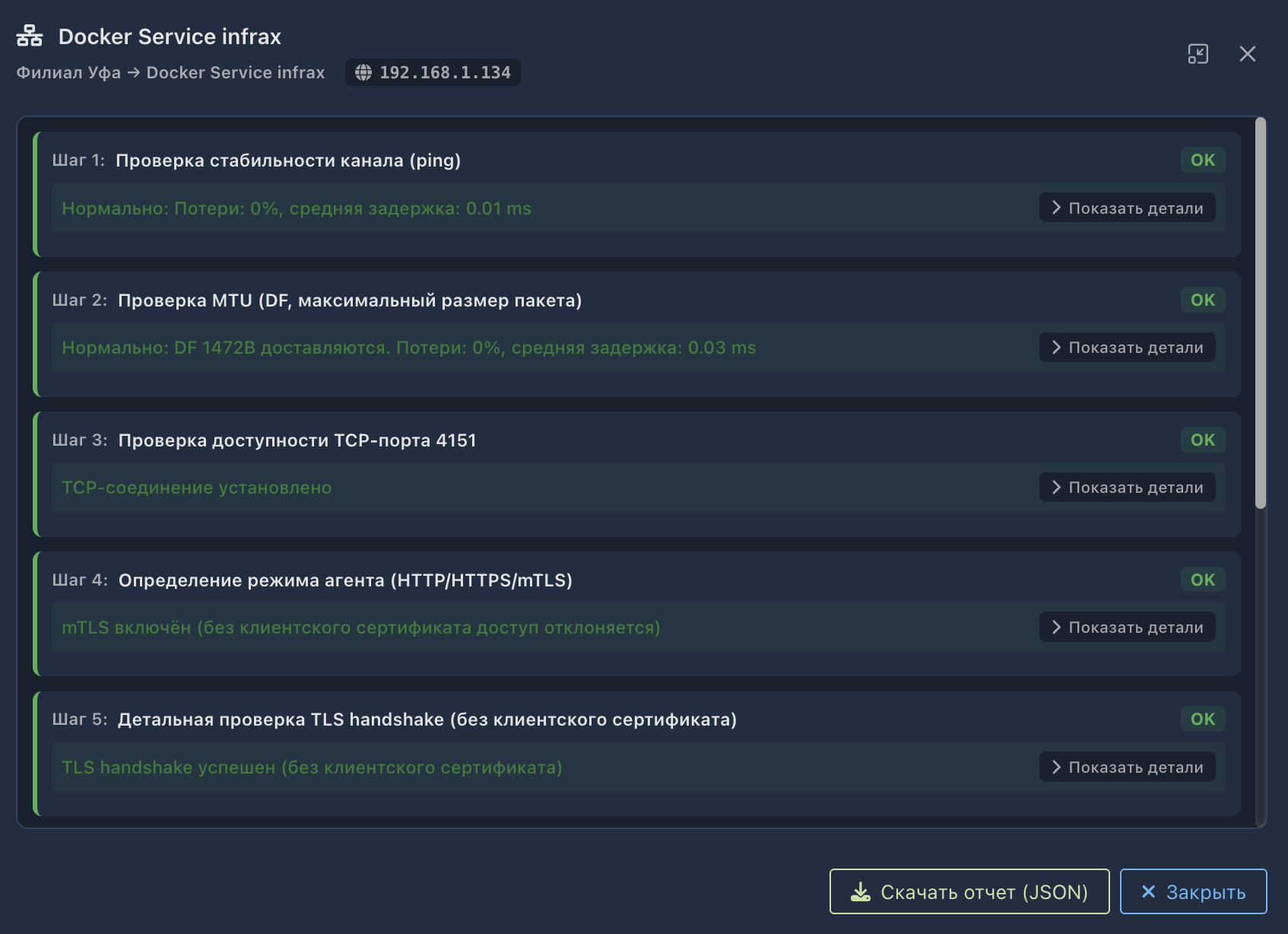 3. Запустите диагностику соединения с агентом — все результаты должны быть положительными.